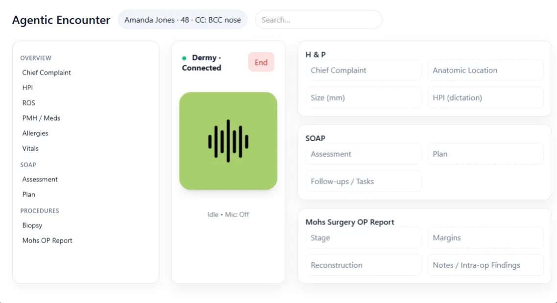 Click or tap the green "Hey, Derme" button when it starts to glow, begin your session. Dictate an encounter with prescriptions, follow-ups, or any other details you want — the more the merrier. When you’re done, click the Hey, Derme button again and let me do the work for you.